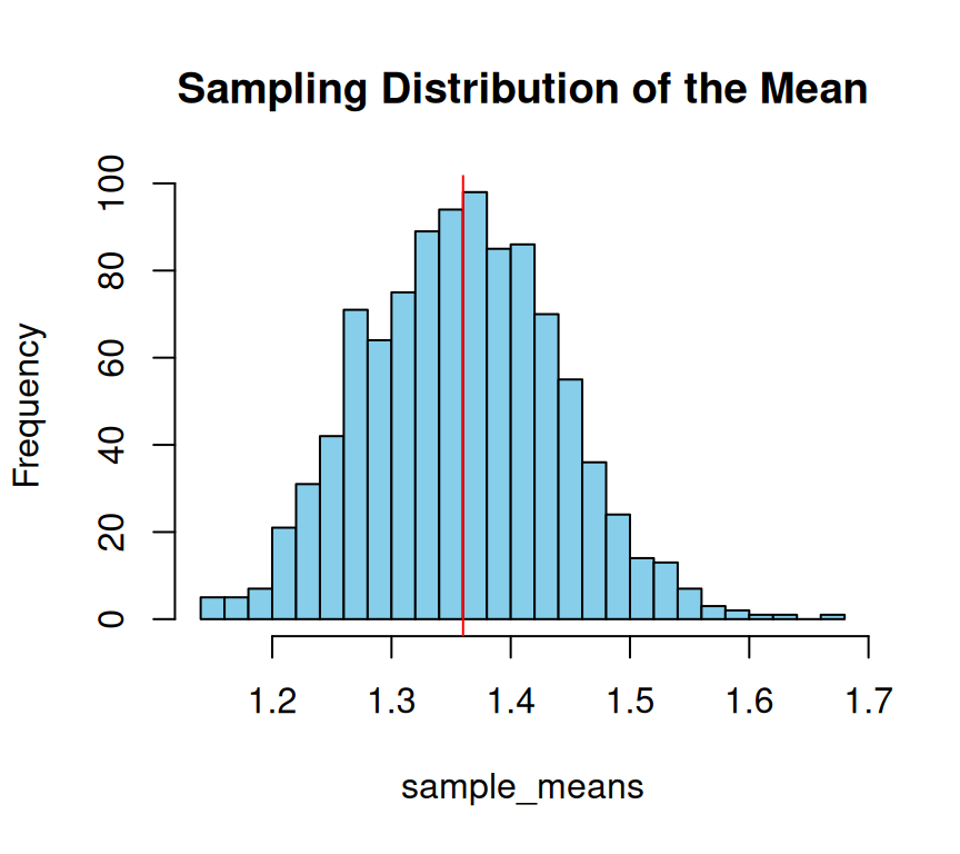 In the above example, we draw 1000 samples of size 30 from this population. For each of these samples, we calculate their means. Finally, we plot a histogram of these sample means, which shows the approximate normal distribution. This means that as the sample size increases, the sample means tend to approach a normal distribution, regardless of the shape of the population distribution. The Central Limit Theorem is a fundamental statistical concept that allows us to make inferences about a population based on a sample. Red line on plot show the population mean.