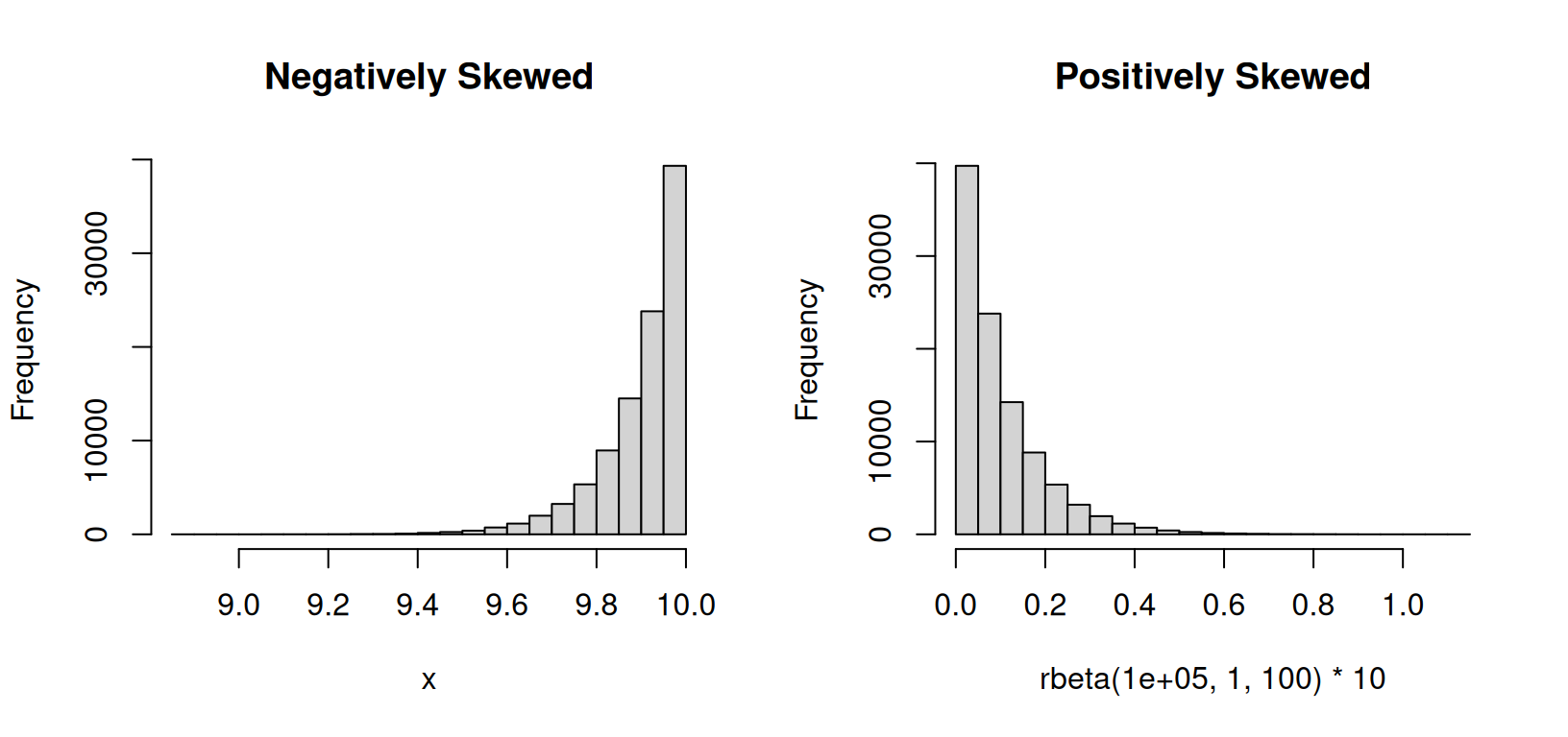 Skewed distribution: A skewed distribution is one in which the data points are not evenly distributed around the mean. There are two types skewed distributions: positively skewed (skewed to the right) and negatively skewed (skewed to the left). In a positively skewed distribution, the tail of the distribution is longer on the right side, while in a negatively skewed distribution, the tail is longer on the left side.