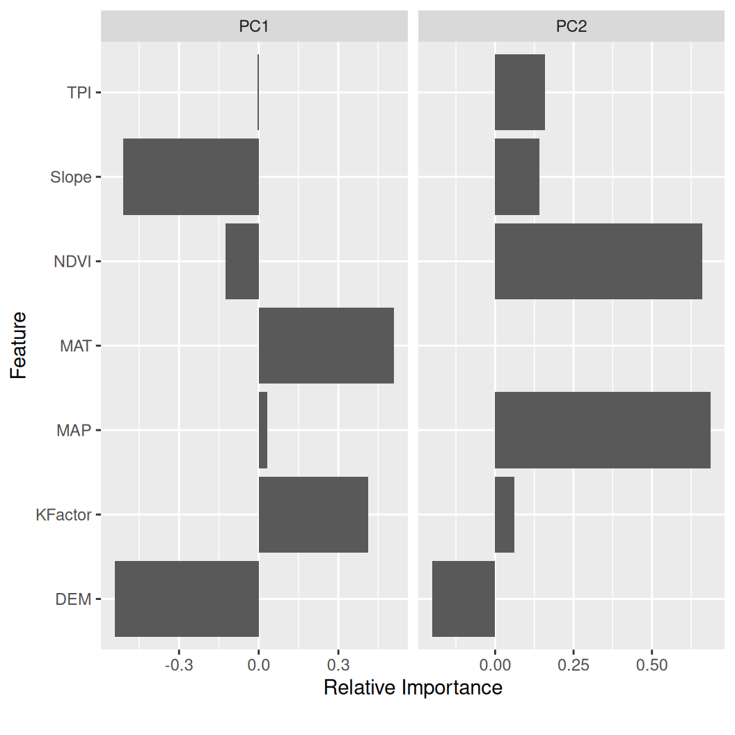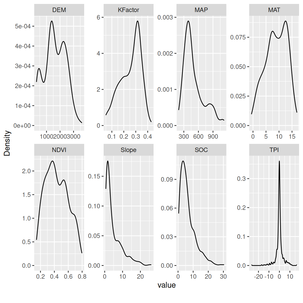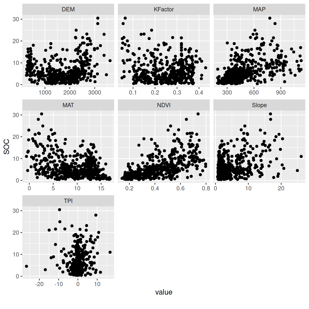 df |> dplyr::select(NLCD, SOC, DEM, MAP, MAT, NDVI) |>