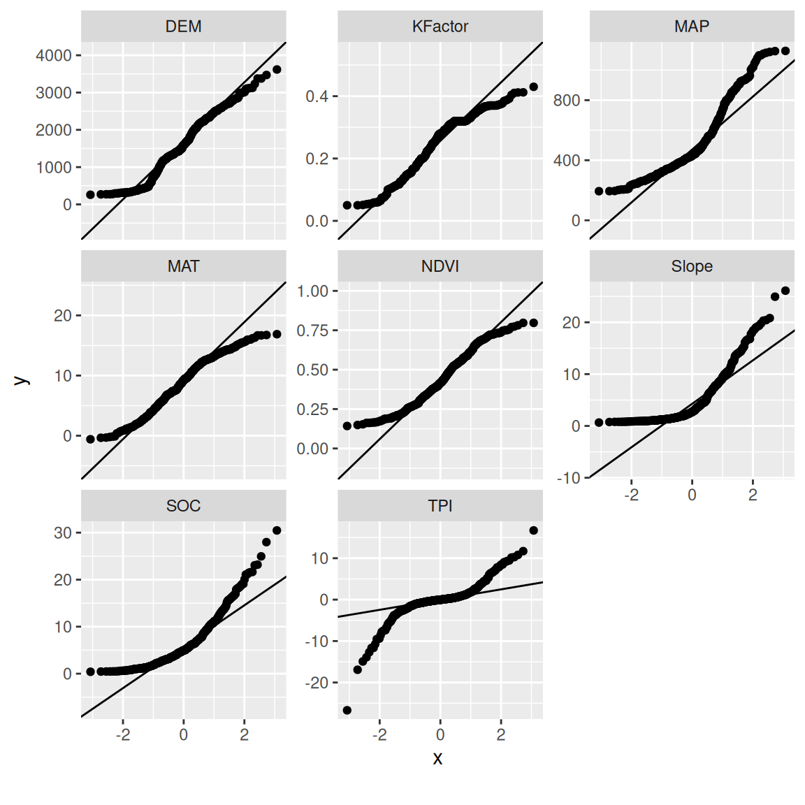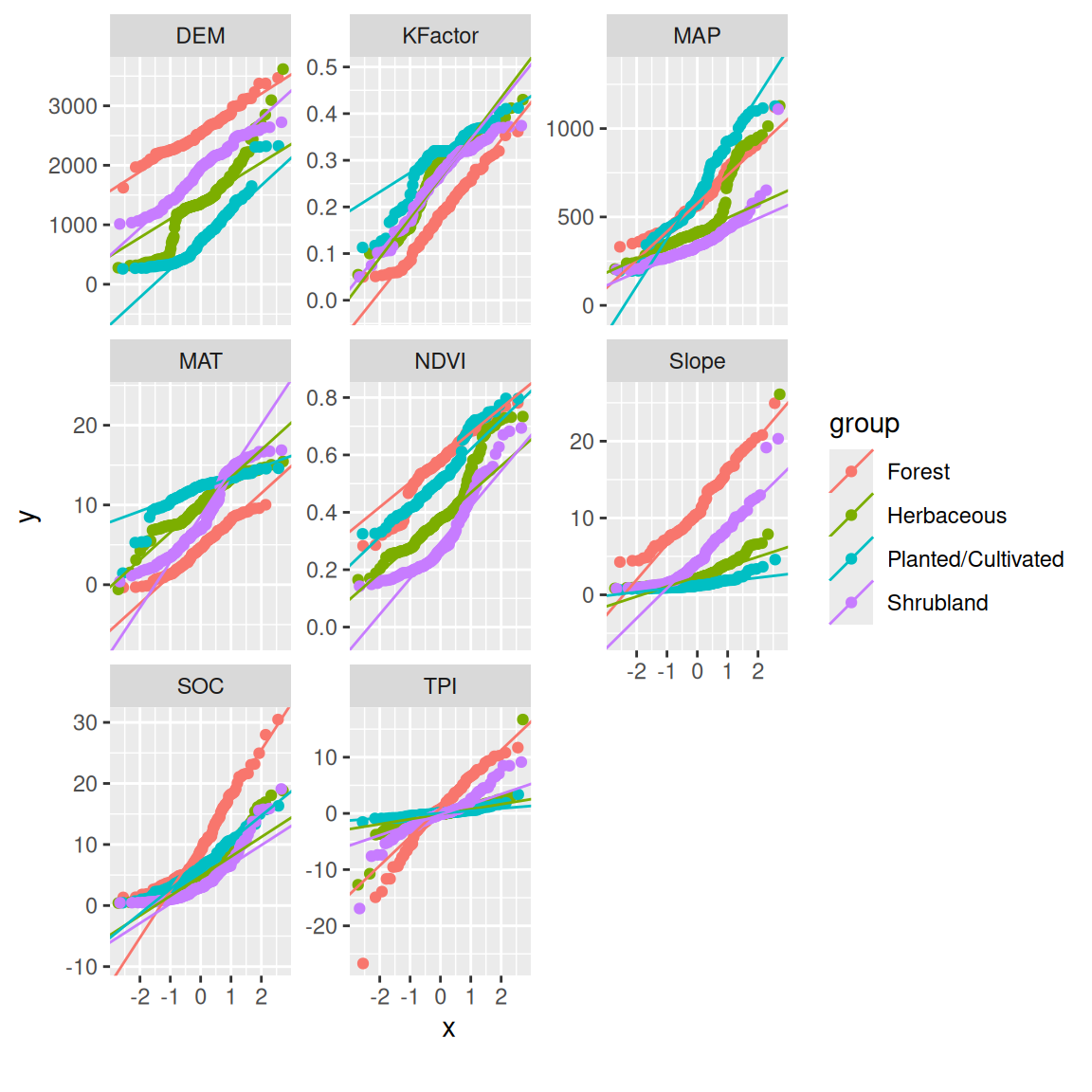 We can view quantile-quantile plot of all continuous variables by feature NLCD